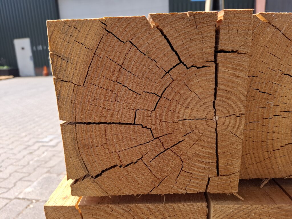 Zo zien we het liever niet! Doordat het hart aanwezig is in de balk ontstaat er veel meer scheurvorming. Deze kwaliteit is een stuk lager dan de 4-ex log kwaliteit.