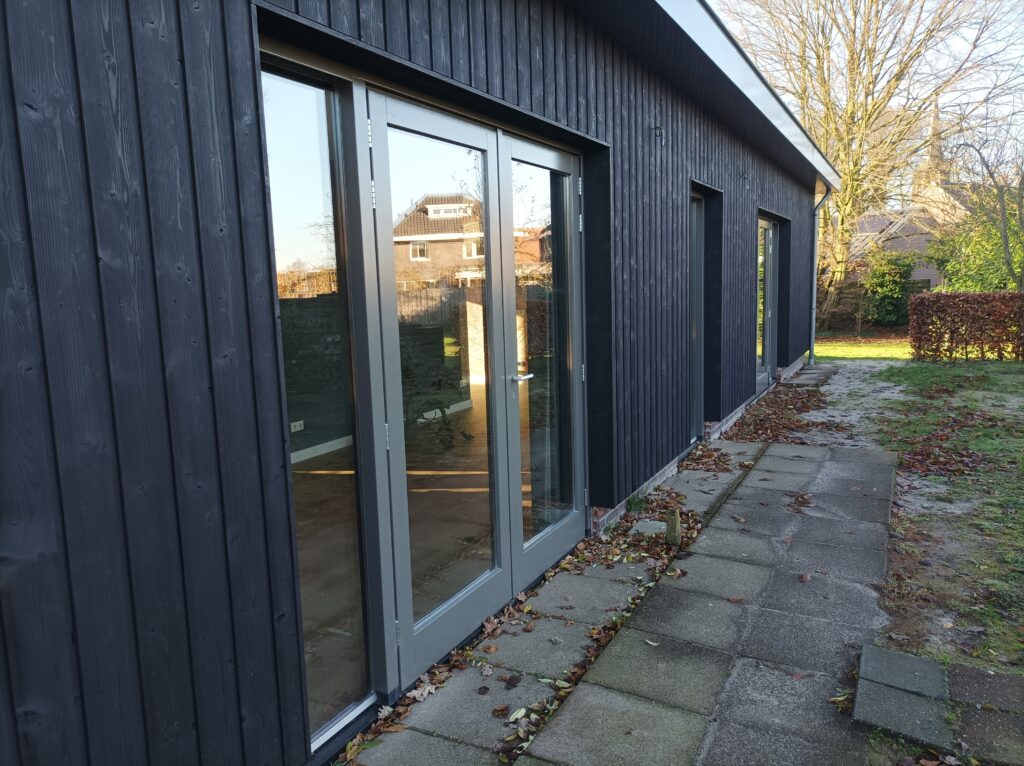 Bij dit project mochten we meedenken met het realiseren van een grote verbouwing! De klant was op zoek naar een zwarte houten gevelbekleding met een robuuste uitstraling. Na een bezoek aan de showroom is er gekozen voor het halfhoutse profiel in thermisch gemodificeerd vuren met een zwarte coating van Rubio Monocoat.